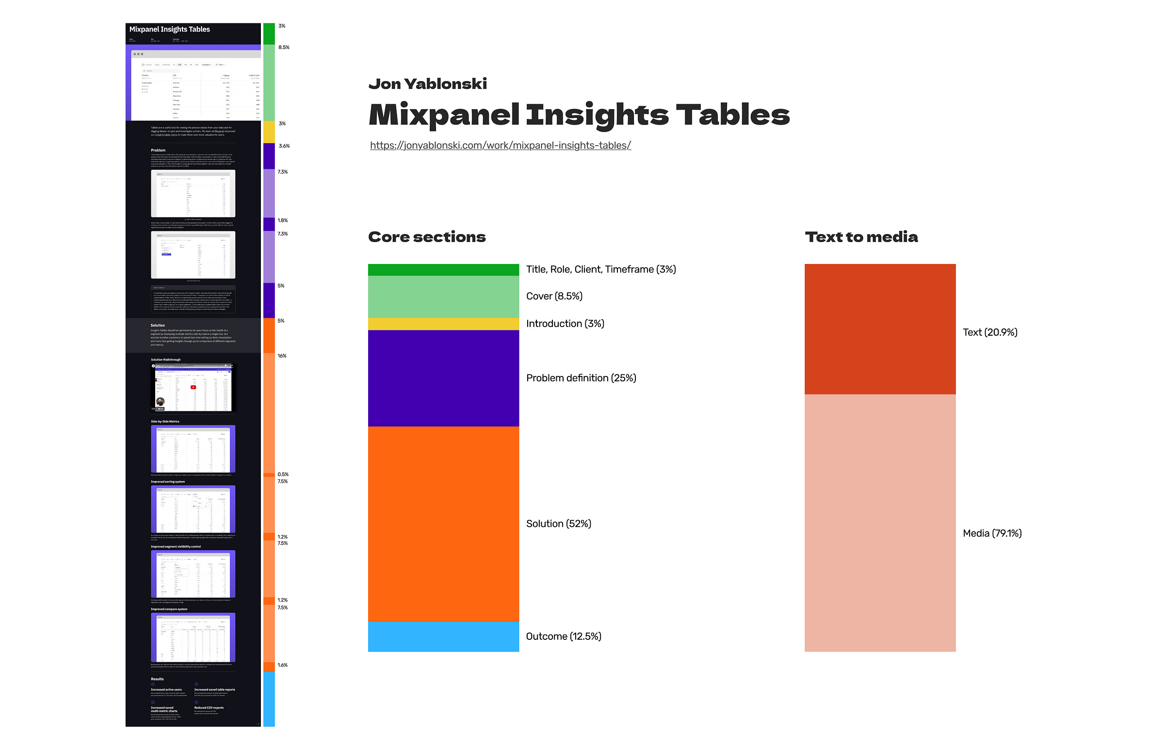 Examining the text-to-media ratio reveals that it is nearly 1:1 in two projects, whereas in Jon Yablonski’s case study, it stands at 1:4, favoring media. I wonder if Jon hadn’t included a video explaining the solution. Would the ratio in his case study be different?