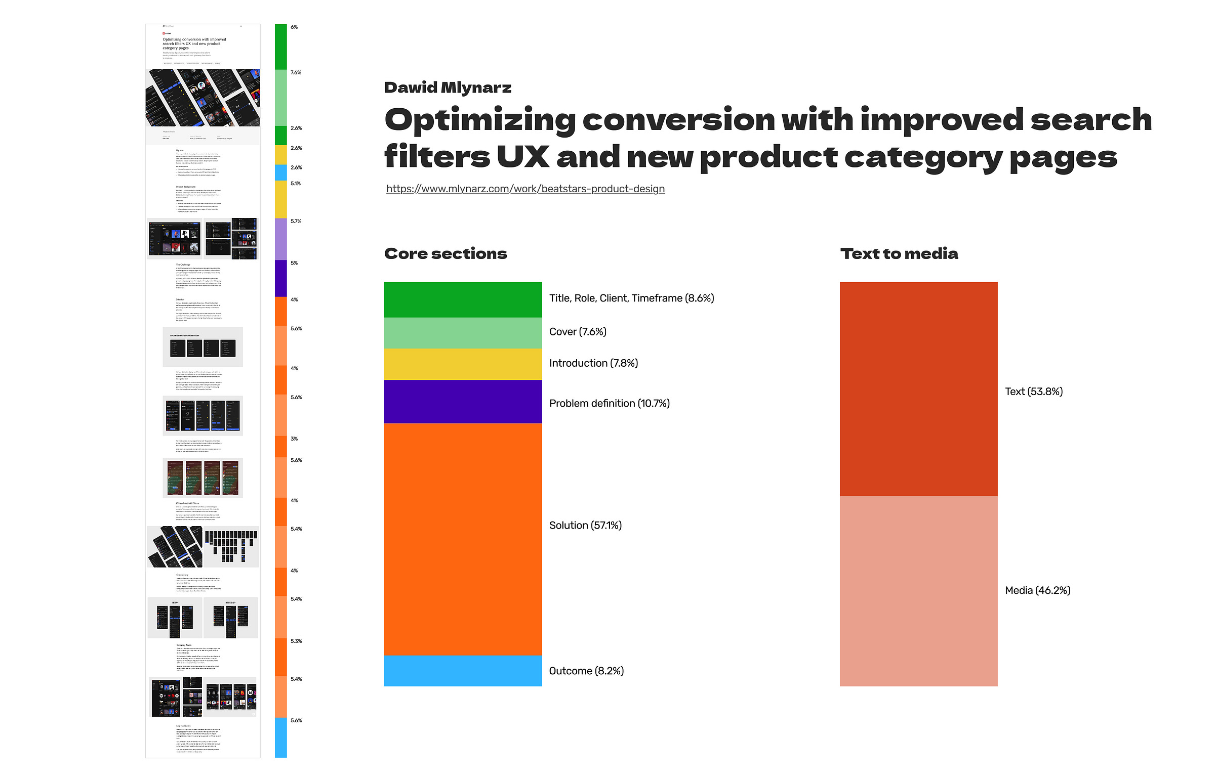 Looking at the results of my little analysis, you can clearly tell that the Solution segment always occupies the heaviest space, on average, 51.5% of the entire case study. This totally makes sense because the solution is something we are most proud of, and in many cases, it’s the most visually appealing.